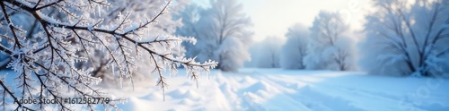 A frosty winter scene with ice crystals clinging to branches, a blanket of snow covering the ground, and a cold, clear sky overhead Perfect for winter, holiday, and nature themes , scenic, solitude