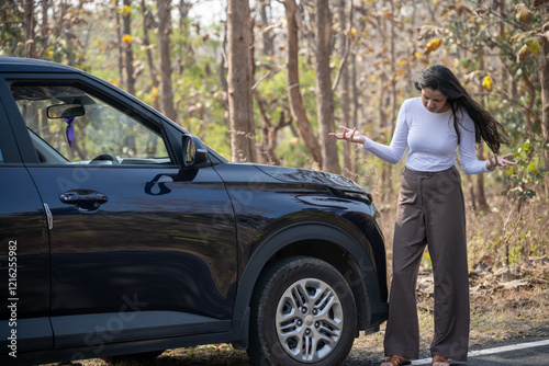 A frustrated girl near her damaged or punctured car