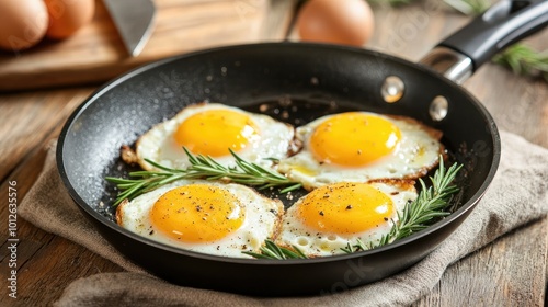 A frying pan with golden fried eggs and rosemary sprigs, placed on a rustic wooden table, with a knife and cutting board visible in the background.