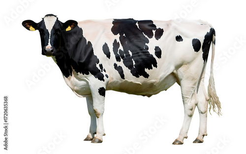 A full body side profile of a black and white holstein friesian cow isolated on transparent background