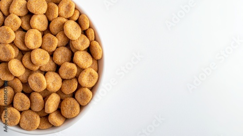 A full bowl of dry, round, brown dog food pellets is seen from an overhead perspective on a stark white background showing the pet food's uniform texture.