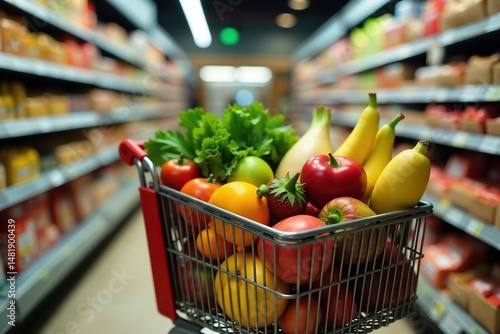 A full grocery cart overflowing with fresh produce, dairy, and packaged goods ready for checkout , groceries shopping, shopping bags, queue