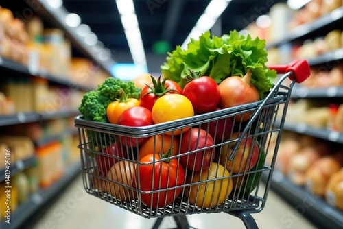 A full grocery cart overflowing with fresh produce, dairy, and packaged goods ready for checkout , line, fresh food
