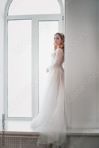 a full length portrait of a beautiful bride with red hair in a white, transparent dress stands in the arch of the window on a wedding morning.