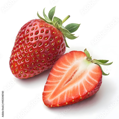 A full ripe strawberry placed next to a single clean slice, showing its bright red interior and tiny seeds.