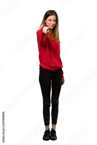 A full-length shot of a Young woman with red sweater points finger at you with a confident expression over isolated white background