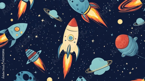 a fun and energetic outer space pattern designed with kid-friendly aesthetics, featuring doodle-style rocket ships blasting off with bright flame trails quirky ufos with glowing details float near