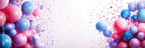 A fun and festive wide-frame carnival background featuring pastel-colored balloons and vibrant confetti, creating a joyful and celebratory atmosphere perfect for birthday designs, party invitations