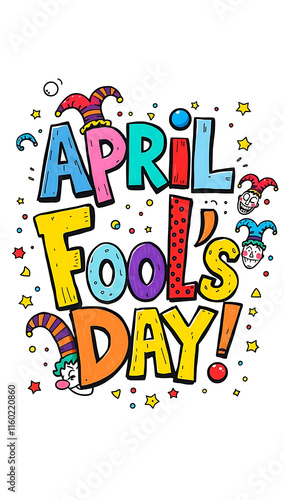 A fun and whimsical typography design that says " April Fool's Day" in quirky, mismatched fonts, with playful doodles of jokers, pranks, and confetti.
