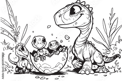 A fun dinosaur-themed coloring page with friendly dinosaurs like T-Rex, Triceratops, and Brachiosaurus in a prehistoric landscape. Great for young dinosaur fans.