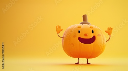 A funny cartoon pumpkin character, waving and smiling.