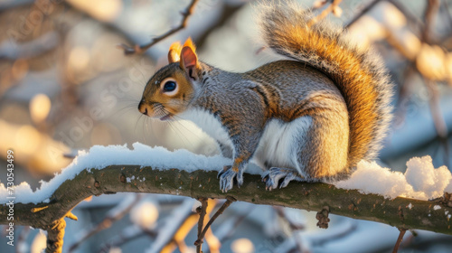A furry squirrel sits atop a snowcovered branch basking in the suns warm rays.