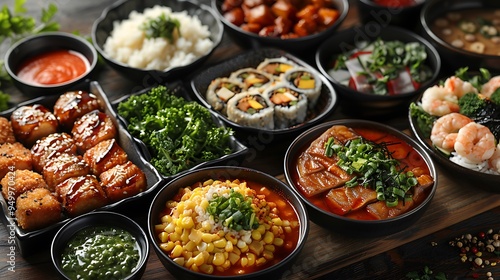 A fusion feast collage showcasing creative dishes like Italian sushi rolls and Mexican ramen, each plated on sleek, contemporary dishes, with a stylish table setting and warm,