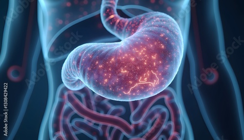 A futuristic 3D medical illustration of a bioengineered artificial stomach.