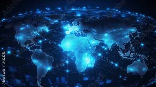 A futuristic 3D rendering of the world map, illuminated with blue digital connections across continents.