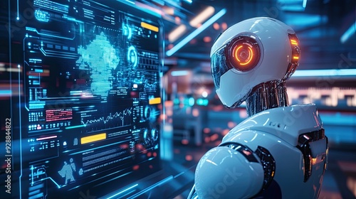 A futuristic 3D scene with an AI robot using machine learning to assess business data, representing the future of financial technology and investment strategies.