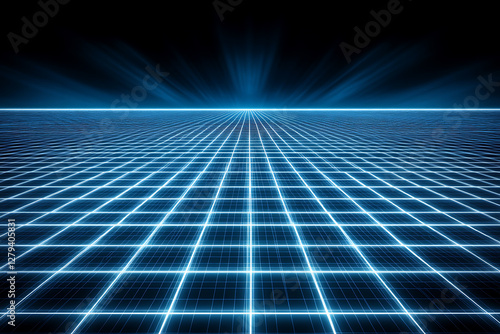 A futuristic abstract background featuring a grid of glowing triangles on a deep blue and black backdrop.