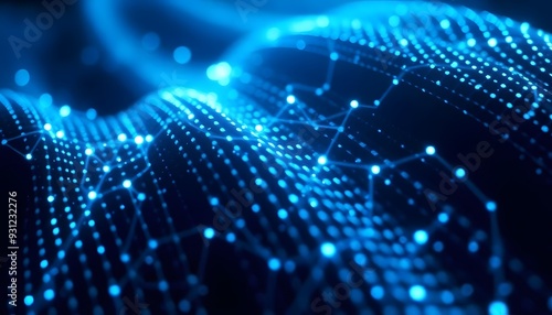A futuristic, abstract background with a grid of glowing blue lines and dots, creating a sense of depth and technology