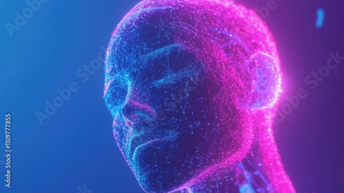 A futuristic abstract composition featuring a glowing humanoid head made of interconnected digital nodes and lines, with a vibrant gradient background in blue and purple tones.