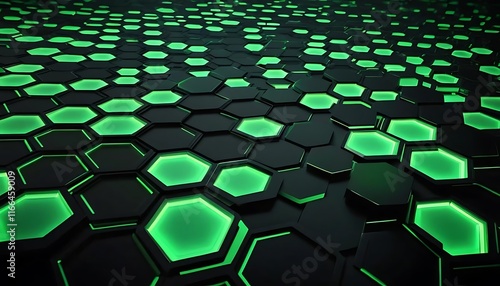 A futuristic abstract pattern with hexagonal grids in glowing green and black tones