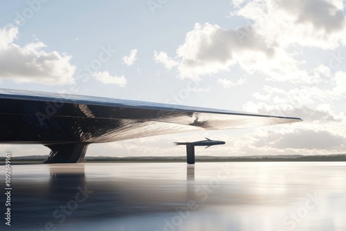 A futuristic aircraft under a sleek solar panel structure, showcasing innovation in transport.