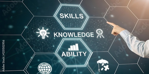 A futuristic and abstract image representing the concept of skills, knowledge, and ability. Use a hexagonal grid layout or a similar geometric pattern to represent interconnected concepts