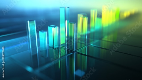 A futuristic bar graph with transparent bars glowing in shades of blue and green, hovering above a reflective surface, symbolizing financial trends