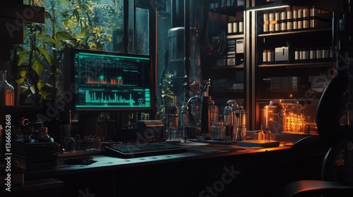A futuristic biofuel production lab with digital monitoring systems.