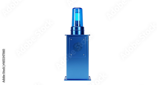A futuristic blue emergency call station, providing security and safety assistance