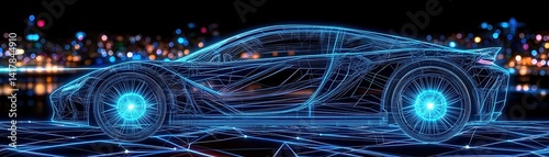 A futuristic car design is depicted in glowing blue lines against a night city backdrop, showcasing advanced technology and sleek aesthetics.