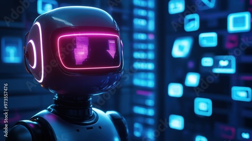A futuristic chat robot assistant with a glowing headpiece, standing in a virtual reality world full of conversation icons