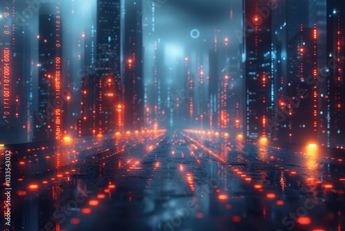 A futuristic city street with red lights reflecting on a wet pavement. AI generative. .