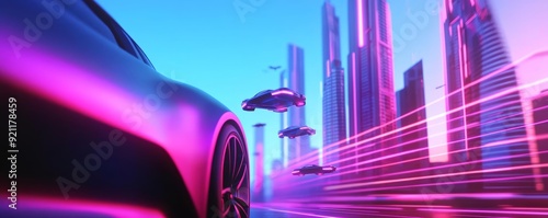 A futuristic city with flying cars and towering skyscrapers, bathed in neon light