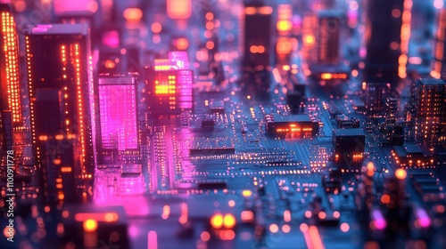 A futuristic city with glowing neon lights built on a circuit board, symbolizing the intersection of technology and urban life.