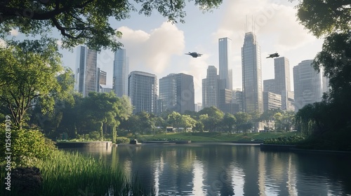 A futuristic city with tall buildings, a peaceful park, and flying cars. It's a digital image showing the financial center.