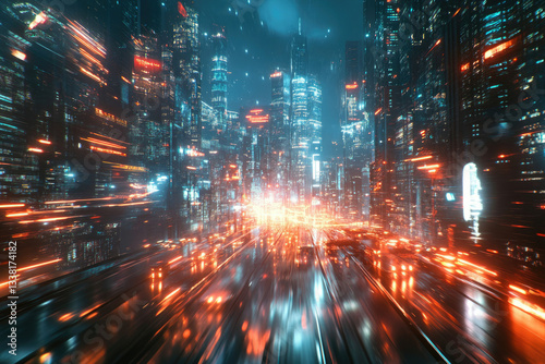 A futuristic cityscape at night, viewed from a speeding vehicle, with vibrant neon lights and motion blur.