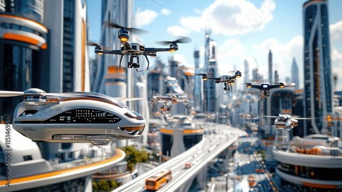 A futuristic cityscape featuring advanced flying vehicles and drones soaring above sleek skyscrapers under a bright blue sky.