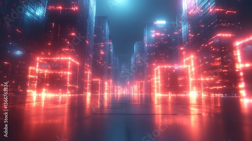 A futuristic cityscape illuminated with vibrant red and blue lights