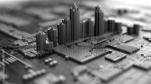 A futuristic cityscape rises from a circuit board, symbolizing the intersection of technology and urban development.