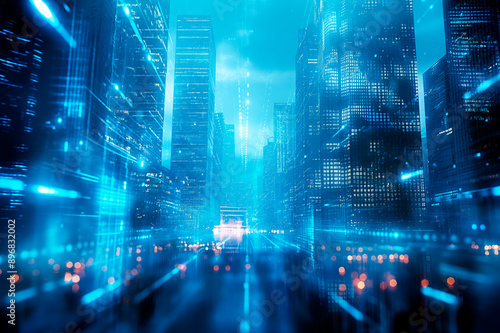 A futuristic cityscape with digital effects, photorealistic style, on a blurred urban background, concept of technology. Generative AI