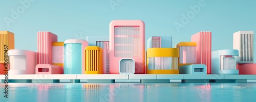 A futuristic cityscape with floating social service buildings, neon art, bright colors, showcasing a utopian welfare society