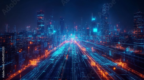 A Futuristic Cityscape with Glowing Neon Lights and Data Streams