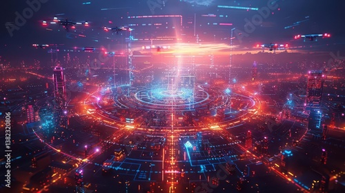 A futuristic cityscape with vibrant neon lights and digital elements illuminating the skyline.