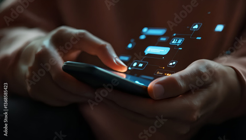A futuristic close-up of a person using a smartphone, chatting with an AI-powered assistant through a glowing, high-tech digital interface.
