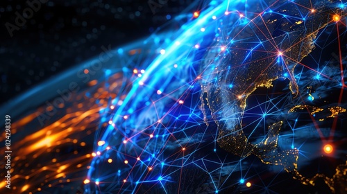 A futuristic communication technology background with Earth, global telecommunication grids, and blockchain links, with space for text
