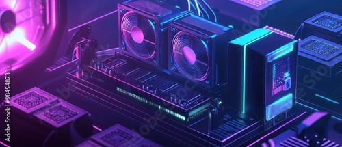 A futuristic computer setup with neon lighting and intricate components.