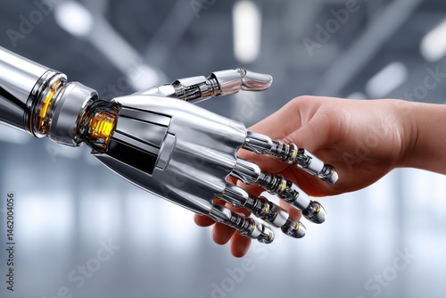 A futuristic concept featuring a robot and a human hand shaking, symbolizing collaboration between humans and advanced artificial intelligence, in a high-tech setting.