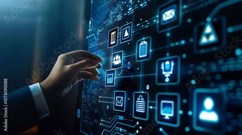 A futuristic concept of AI legal standards, where a businessman touches a digital interface with AI governance and compliance icons.