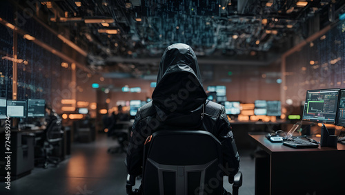 A futuristic cybersecurity workspace featuring advanced encryption technologies, biometric access control