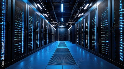 A futuristic data center with illuminated blue server racks and complex overhead cabling in a secure environment. Ideal for cloud computing, cybersecurity, and IT infrastructure themes
